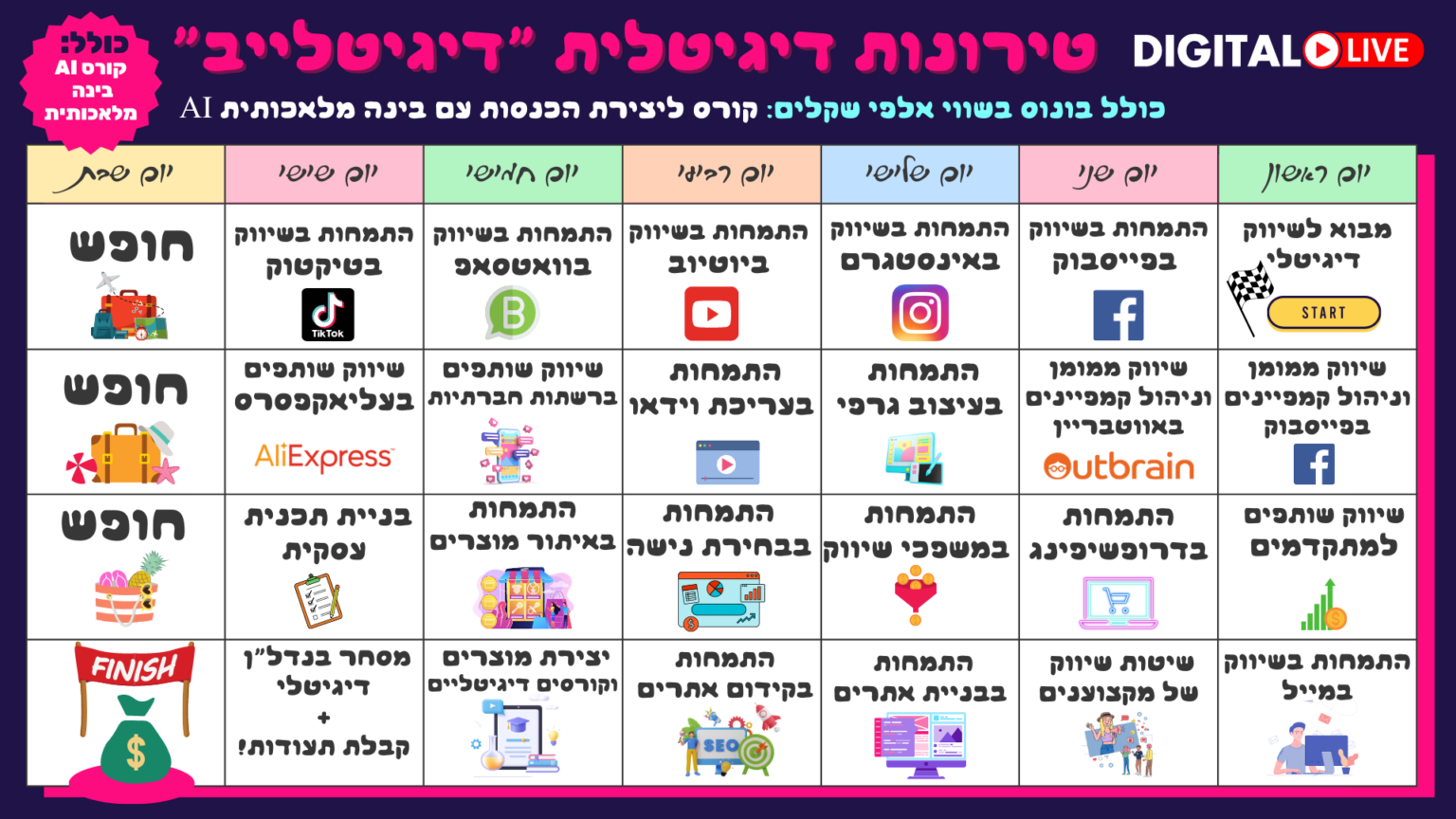 תוכנית ההכשרה המובילה בישראל לשיווק דיגיטלי ויצירת הכנסות מהאינטרנט שתאפשר לכם לשדרג את הקריירה ולהרוויח משכורות של עד עשרות אלפי שקלים בחודש!